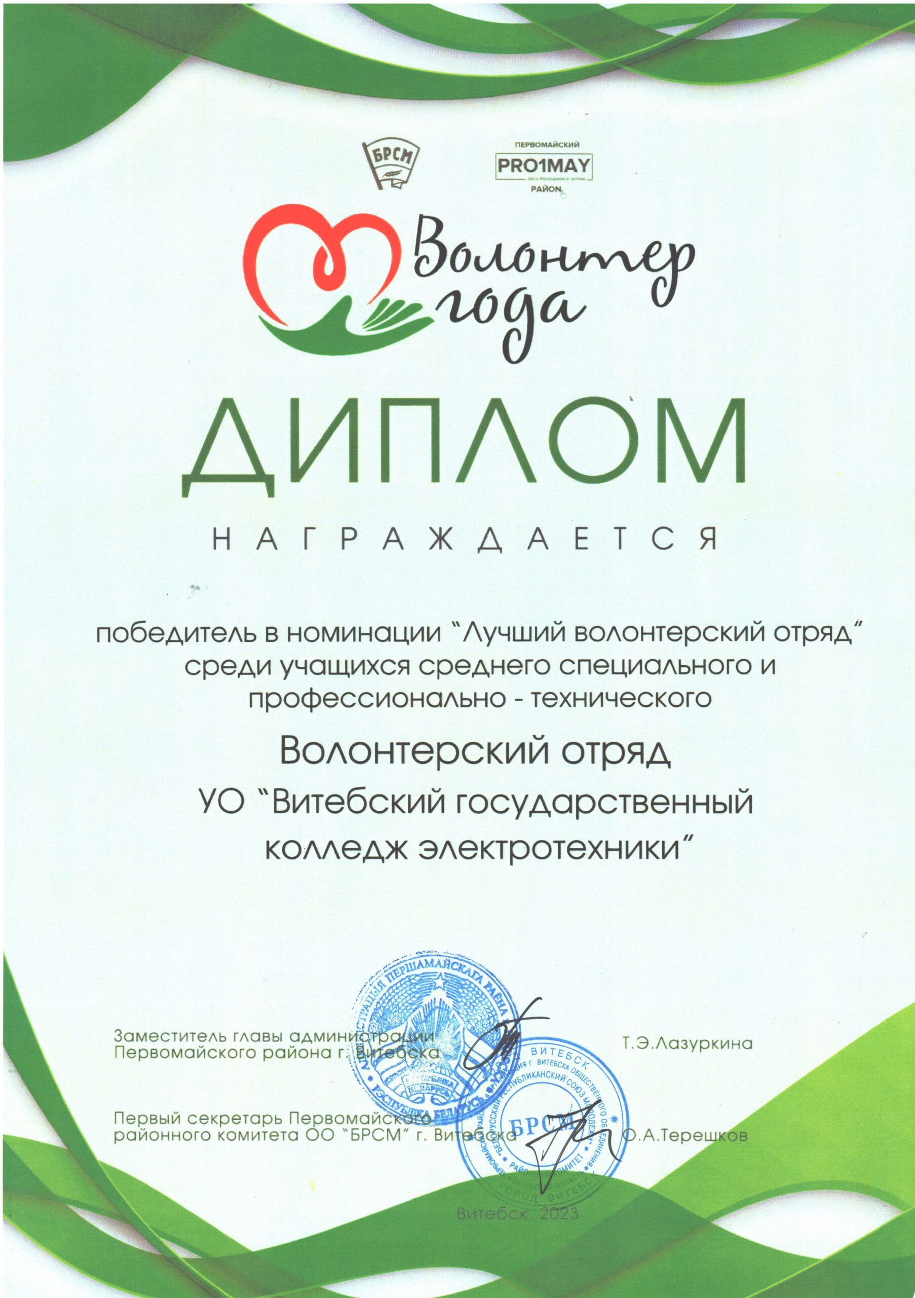 Волонтерский отряд ВГКЭ «Молодежь 21 века» стал победителем в номинации «Лучший волонтерский отряд» среди учащихся среднего специального и профессионально-технического образования.