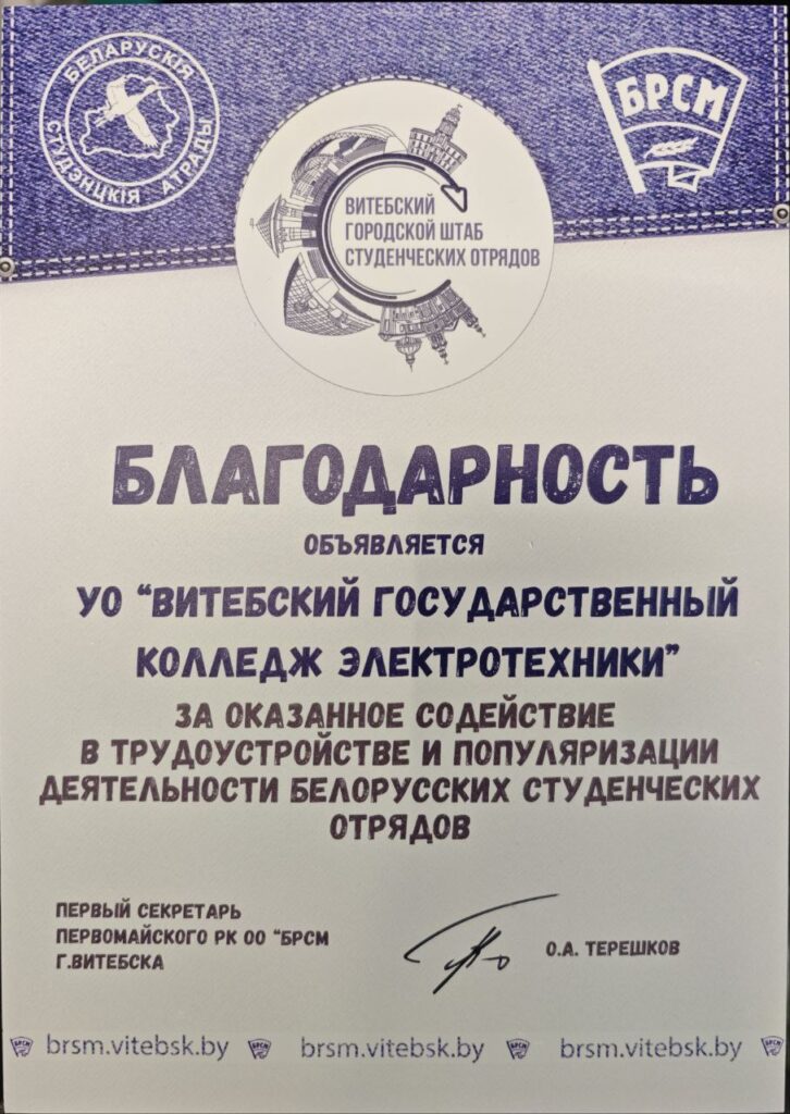 УО «Витебский государственный колледж электротехники» получил благодарность за оказание содействия в трудоустройстве и популяризации деятельности белорусских студенческих отрядов.