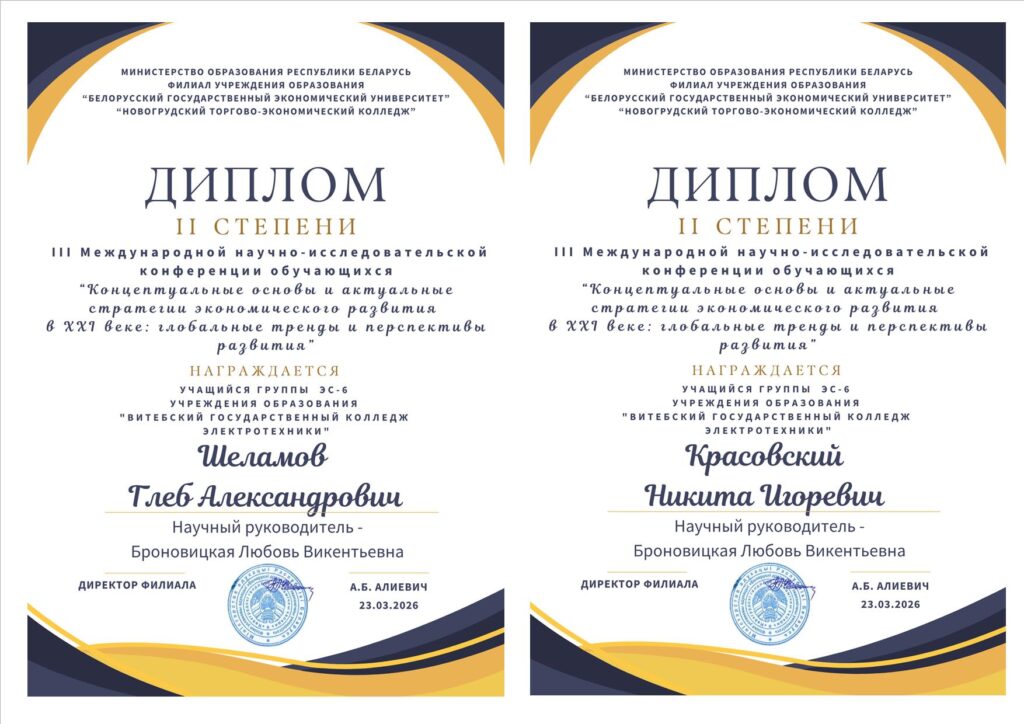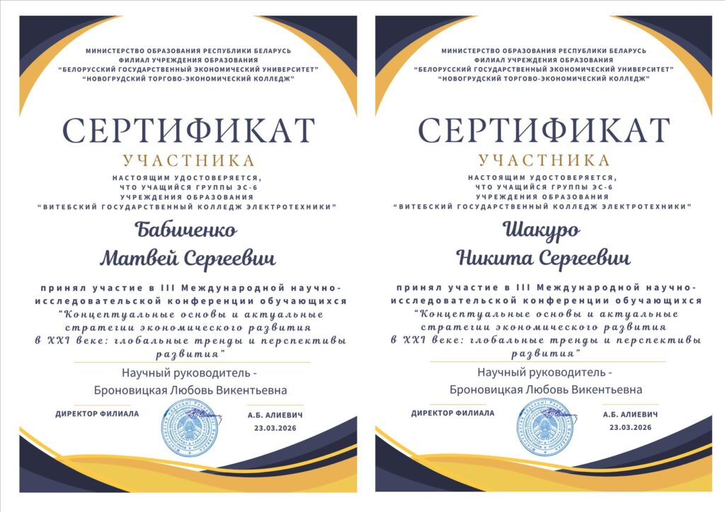 Учащиеся группы ЭС-6 приняли заочное участие в международной научно-исследовательской конференции обучающихся «Концептуальные основы и актуальные стратегии экономического развития в XXI веке: глобальные тренды и перспективы развития», организованной филиалом УО «Белорусский государственный экономический университет» «Новогрудский торгово-экономический колледж». Под руководством преподавателя Броновицкой Любови Викентьевны: Красовский Никита и Шеламов Глеб представили работу «Сознательное энергосбережение» и удостоены диплома II степени. Бабиченко Матвей и Шакуро Никита выступили с работой «Очевидцы и участники освобождения Витебского края» и получили сертификаты участников. Поздравляем ребят и их руководителя с достойными результатами!